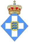 Ecartelé: en I et IV, d'or, à trois cœurs de gueules, posés en un pal, à un lion léopardés d'azur, armés et lampassés de gueules, couronnés du champ, brochant sur-le-tout (de Danemark) en II et III de gueles au château d'argent au centre des Tours d'une rose de argent; sur-le-tout-du-tout d'or à deux fasces de gueules (de Oldenbourg)