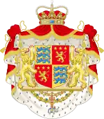 Écartelé : à la croix pattée d'argent bordée de gueules, qui est le Danebrog, cantonnée en I et IV, d'or, à neuf cœurs de gueules, posés en trois pals, à trois lions léopardés d'azur, armés et lampassés de gueules, couronnés du champ, brochant sur-le-tout (de Danemark) ; en II, de gueules, au lion couronné d'or, tenant dans ses pattes une hache danoise d'argent, emmanchée du second (de Norvège ancien) ; en III, , de gueules au dragon d'or (du Royaume des Vandales) ; sur-le-tout écartelé : 1 et 4, d'or, à deux lions léopardés d'azur, armés et lampassés de gueules (de Schleswig) ; en 2, de gueules, à la feuille d'ortie d'argent (de Holstein) ; en 3, de gueules, au cygne d'argent, becqué, membré et colleté d'une couronne d'or (Stormarn) ; sur-le-tout-du-tout, d'or à deux fasces de gueules (de Oldenbourg)[4]. |