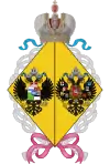 Aux armes des frères et fils cadets de l'empereur, avec deux canons en sautoir derrière l'écu Armes alternatives (1858): D'argent au griffon de gueules tenant une épée de même et une rondache d'or à la bande de gueules, le tout à la bordure de sable à huit têtes de lion alternées d'or et d'argent. L'écu est surmonté du heaume du Saint prince Alexandre Nevski sur lequel est inscrit la devise "Съ нами богь" (Dieu est avec nous) et cimé de l'aigle impériale de Russie, avec l'écu de Moscovie entouré du collier de l'ordre du Saint Apôtre André le premier appelé sur la poitrine et des tsarats de Kazan, d'Astrakhan, de Pologne, de Sibérie, de Tauride, de Géorgie, des grands-duchés de Kiev, Vladimir et Novgorod et de celui de Finlande sur les ailes. [13]. Il s'agit des armes des Romanov, avec la bande de la maison de bade sur la rondache, en hommage à sa femme Cécile de Bade. |