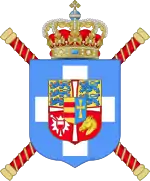 armes comme commandeur-en-chef des armées de Grèce D'azur, à la croix alésée d'argent (de Grèce), sur-le-tout écartelé Glücksbourg/Glucksborg simplifié : à la croix pattée d'argent bordée de gueules, qui est le Danebrog, cantonnée en I, d'or, à neuf cœurs de gueules, posés en trois pals, à trois lions léopardés d'azur, armés et lampassés de gueules, couronnés du champ, brochant sur-le-tout (de Danemark) ; en II, d'or, à deux lions léopardés d'azur, armés et lampassés de gueules (de Schleswig) ; en III,de gueules, à la feuille d'ortie d'argent (de Holstein), en IV de gueules à la tête de cheval coupée d'or (de Lauenbourg) ; sur-le-tout-du-tout parti d'or à deux fasces de gueules (de Oldenbourg) et d'azur, à la croix pattée, au pied fiché d'or (de Delmenhorst) avec deuxs batons un Marshal de Grèce |