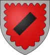 de gueules à la bordure engrélée d'argent et au bâton de sable péri en barre[1].