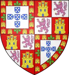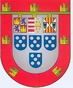 écartelé, au I et IV d'argent, à cinq écussons d'azur, posés en croix, les deux de flanc mis de côté, chaque écusson chargé de cinq besants du champ, posés en sautoir, à la bordure de gueules, chargée de douze châteaux d'or, donjonnés de trois tours, ouverts et ajourés d'azur, aux quatre fleurs de lys de sinople, brisé d'un lambel d'argent, chaque pendant chargé de trois mouchetures d'hermine (qui est d'Aviz-Coimbra), et au II et III d'or à 4 pals de gueules (qui est d'Aragon). |