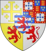 écartelé, au I d'argent, à la croix potencée d'or, cantonnée de quatre croisettes du même (qui est de Jérusalem), au II contre-écartelé au 1 et 4 d'argent au cinq écussons d'azur disposés en croix, les écussons latéraux couchés, chaque écusson chargé de cinq besants d'argent disposés en sautoir, à la bordure de gueules chargée de neuf châteaux d'or, donjonnés de trois tours, ouverts et ajourés d'azur et chargé des quatre bouts évidents d'une croix fleurdelisé de sinople (qui est de Portugal) et au 2 et 3 contre-écartelé au 1 et 4 d'azur à trois fleurs de lys d'or (qui est de France) et au 2 et 3 de gueules aux trois léopards d'or, au III d'or au lion de gueules, armé, lampassé et couronné d'azur (qui est d'Arménie) et au IV d'argent au lion de gueules, armé, lampassé et couronné d'or, brochant sur le tout (qui est de Chypre), sur le tout burelé d'argent et d'azur de huit pièces, au lion de gueules, armé, lampassé et couronné d'or, brochant sur le tout (qui est de Lusignan-Chypre)[2]. |