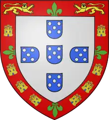 Jean Ier de Portugal, portés ensuite par les rois de Portugal qui lui succèdent jusqu'à Jean II. d'argent aux cinq écussons d'azur disposés en croix, l'écussons latérales couchés, chaque écusson chargé de cinq besants d'argent disposés en sautoir, à la bordure de gueules chargée de douze châteaux d'or, donjonnés de trois tours, ouverts et ajourés d'azur et chargé des quatre bouts évidents d'une croix fleurdelisé de sinople[1],[2]. |