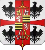 (fr)D’argent, à la croix pattée de gueules cantonnée de quatre aigles de sable au vol abaissé; sur le tout écartelé, au premier et au quatrième de gueules au lion à la queue fourchée d'argent armé et lampassé d’or, couronné et colleté du même, au deuxième et au troisième fascé d'or et de sable