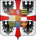(fr)D’argent, à la croix pattée de gueules cantonnée de quatre aigles de sable éployées et affrontées; sur le tout parti de deux et coupé de deux, au premier de gueules à l'aigle bicéphale éployée d'or à la double couronne du même, qui est de l'Empire Romain d'Orient, au deuxième de gueules au lion à la queue fourchée d'argent, armé et lampassé d'or, couronné et colleté du même qui est de Bohême, au troisième fascé d'or et de sable qui est de Gonzague ancien, au quatrième d’argent à la croix potencée d'or cantonnée de quatre croisettes du même qui est de Jérusalem, au cinquième d'or aux quatre pals de gueules qui est d'Aragon, au sixième d’argent au chef de gueules qui est de Montferrat, au septième fascé d’or et de sable de dix pièces au crancelin de sinople brochant en bande qui est de Saxe, au huitième d’azur semé de croisettes recroisettées et de clous d’or à deux bars adossés du même qui est de Bar, au neuvième de gueules à la croix d'or cantonnée de quatre briquets du même adossés deux par deux qui est de Constantinople; au point d'honneur, de gueules à la fasce d'argent qui est d'Autriche, timbré d'une couronne archiducale