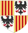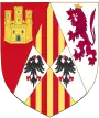 Écartelé en sautoir d'or aux quatre pals de gueules qui est d'Aragon et d'argent à l'aigle de sable membré et becqué de gueules qui est de Hohenstaufen[29].