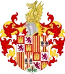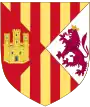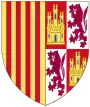Ferdinand II, roi d'Aragon (1452 † 1516), Ferdinand V, roi de Castille (1474 - 1504) avec Isabelle Ier. 1474 - 1492 : Écartelé en I et IV contre-écartelé en 1 et 4, de gueules au château d'or ouvert et ajouré d'azur et en 2 et 3 d'argent au lion de gueules armé, lampassé et couronné d'or; en II et en III parti, en 1 d'or à quatre pals de gueules et en 2 écartelé en sautoir d'or aux quatre pals de gueules et d'argent à l'aigle de sable 1492 - 1504 : Écartelé en I et IV contre-écartelé en 1 et 4, de gueules au château d'or ouvert et ajouré d'azur et en 2 et 3 d'argent au lion de gueules armé, lampassé et couronné d'or; en II et en III parti, en 1 d'or à quatre pals de gueules et en 2 écartelé en sautoir d'or aux quatre pals de gueules et d'argent à l'aigle de sable, le tout accompagné en pointe d'argent à une pomme grenade de gueules, tigée et feuilleté de sinople[2]. 1504 - 1513 : Écartelé en I et IV contre-écartelé en 1 et 4, de gueules au château d'or ouvert et ajouré d'azur et en 2 et 3 d'argent au lion de gueules armé, lampassé et couronné d'or; en II, parti en 1 d'or à quatre pals de gueules; en 2 parti, en a d'argent à la croix potencé d'or et en b fasce de gueules et d'argent et en III parti, en 1 d'or à quatre pals de gueules et en 2 écartelé en sautoir d'or aux quatre pals de gueules et d'argent à l'aigle de sable, le tout accompagné en pointe d'argent à une pomme grenade de gueules, tigée et feuilleté de sinople[2]. 1513 - 1516 : Écartelé en I et IV contre-écartelé en 1 et 4, de gueules au château d'or ouvert et ajouré d'azur et en 2 et 3 d'argent au lion de gueules armé, lampassé et couronné d'or; en II, parti en 1 coupé d'or à quatre pals de gueules et de gueules aux chaînes d'or posées en orle, en croix et en sautoir, chargées en cœur d'une émeraude au naturel; en 2 parti, en a d'argent à la croix potencé d'or et en b fasce de gueules et d'argent et en III parti, en 1 d'or à quatre pals de gueules et en 2 écartelé en sautoir d'or aux quatre pals de gueules et d'argent à l'aigle de sable, le tout accompagné en pointe d'argent à une pomme grenade de gueules, tigée et feuilleté de sinople[2]. |
