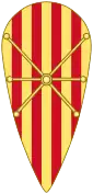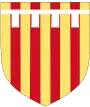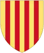 Raimond-Bérenger IV, comte de Barcelone et Alphonse II, roi d'Aragon, (1150 - 1177) : D'or à quatre pals de gueules à l'escarboucle pommetée à six rais d'or brochant sur le tout[1]. (Armes du comté de Barcelone devenues celles des rois d'Aragon après qu'Alphonse Ier, comte de Barcelone, devint roi d'Aragon). L'histoire de cet écu est la suivante: le roi se meurt lors d'une bataille à "déterminer". L'un de ses compagnons pose sa main sur son corps ensanglanté puis dépose quatre doigts de sa main sur son bouclier et trace quatre bandes rouge sang sur ce bouclier doré. |