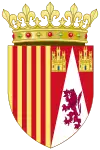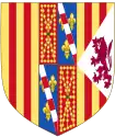 Jeanne Enríquez (1425 † 1468), consort de Jean II, roi de Navarre et d'Aragon. Parti en 1 d'or à quatre pals de gueules et en 2 de gueules à deux châteaux d'or ouvert et ajouré d'azur; à la pointe d'argent au lion de pourpre armé et lampassé d'or[2]. |