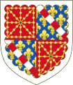 Jeanne de France (1343 † 1373), consort de Charles II, roi de Navarre. Parti, en 1 de gueules aux chaînes d'or posées en orle, en croix et en sautoir, chargées en cœur d'une émeraude au nature et en 2 coupé d'azur semé de fleurs de lys d'or à la bande componée d'argent et de gueules et d'azur semé de fleurs de lys d'or[1]. |