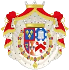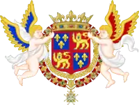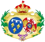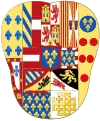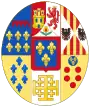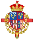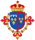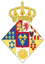 parti de deux, en I coupé d'or aux six fleurs de lys d'azur posées 3, 2 et 1, (qui est de Farnèse) et d'argent, à cinq écussons d'azur, posés en croix, les deux de flanc mis de côté, chaque écusson chargé de cinq besants du champ, posés en sautoir, à la bordure de gueules, chargée de neuf châteaux d'or, donjonnés de trois tours, ouverts et ajourés d'azur (qui est du Portugal), en II coupé écartelé en 1 et 4, de gueules au château d'or ouvert et ajouré d'azur (qui est de Castille) et en 2 et 3 d'argent au lion de gueules armé, lampassé et couronné d'or (qui est deon) et d'azur semé de fleurs de lys d'or au lambel de gueules (qui est de Naples) et en III d'or à six tourteaux mis en orle, cinq de gueules, celui en chef d'azur chargé de trois fleurs de lis d'or (qui est de Toscane) ; sur le tout d'azur, à trois fleurs de lys d'or, à la bordure de gueules, (qui est d'Anjou)[45]. |