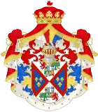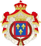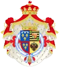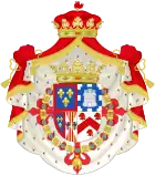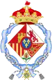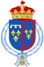 1866[Information douteuse]-1930 : parti en I, écartelé en 1 d'azur aux trois fleurs de lis d'or au lambel d'argent (d'Orléans), en 2 d'azur aux trois fleurs de lys d'or à la bourdure de gueules (d'Anjou) et en 3 et 4 parti en 1 d'azur aux trois fleurs de lys d'or à la bourdure de gueules et 2 écartelé en sautoir d'or aux quatre pals de gueules et d'argent à l'aigle de sable (de Bourbon-Deux Siciles) ; en II écartelé en 1 et 4, de gueules au château d'or ouvert et ajouré d'azur et en 2 et 3 d'argent au lion de gueules armé, lampassé et couronné d'or, enté en pointe du sur-le-tout d'argent à une pomme grenade de gueules, tigée et feuilleté de sinople sur-le-tout d'azur à trois fleurs de lys d'or à la bordure de gueules, après 1883, d'azur à trois fleurs de lys d'or[Information douteuse]. 1930-1958 : écartelé en 1 et 4, de gueules au château d'or ouvert et ajouré d'azur et en 2 et 3 d'argent au lion de gueules armé, lampassé et couronné d'or, enté en pointe du sur-le-tout d'argent à une pomme grenade de gueules, tigée et feuilleté de sinople sur-le-tout d'azur à trois fleurs de lys d'or[Information douteuse]. |
