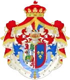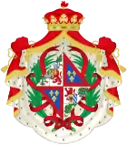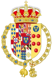 parti en I, d'argent à cinq écussons d'azur en croix, chargés chacun de cinq besants en sautoir, le tout augmenté d'une bordure de gueules à sept châteaux d'or ouverts d'azu (de Portugal) ; en II coupé : en chef parti en 1 écartelé en 1 et 4, de gueules au château d'or ouvert et ajouré d'azur et en 2 et 3 d'argent au lion de gueules armé, lampassé et couronné d'or enté en pointe d'argent à une pomme grenade de gueules, tigée et feuilleté de sinople; 2 parti en 1 d'or à quatre pals de gueules et en 2 écartelé en sautoir d'or aux quatre pals de gueules et d'argent à l'aigle de sable;II, tigée et feuilleté de sinople et en pointe écartelé en 1 de gueules à la fasce d'argent; 2, d'azur semé de fleurs de lys d'or à la bande componée d'argent et de gueules, en 3 bandé d'or et d'azur de six pièces, à la bordure de gueules 4, de sable au lion d'or, armé et lampassé de gueules; enté en pointe parti d'or au lion de sable armé, couronné et lampassé de gueules et d'argent à l'aigle éployé de gueules, membré et becqué d'or;sur le tout d'azur à trois fleurs de lys d'or à la bordure de gueules[29]. coupé de deux : en I, d'argent à cinq écussons d'azur en croix, chargés chacun de cinq besants en sautoir, le tout augmenté d'une bordure de gueules à sept châteaux d'or ouverts d'azu (de Portugal) ; en II, coupé : en chef parti en 1 écartelé en 1 et 4, de gueules au château d'or ouvert et ajouré d'azur et en 2 et 3 d'argent au lion de gueules armé, lampassé et couronné d'or enté en pointe d'argent à une pomme grenade de gueules, tigée et feuilleté de sinople; 2 parti en 1 d'or à quatre pals de gueules et en 2 écartelé en sautoir d'or aux quatre pals de gueules et d'argent à l'aigle de sable;II, tigée et feuilleté de sinople et en pointe écartelé en 1 de gueules à la fasce d'argent; 2, d'azur semé de fleurs de lys d'or à la bande componée d'argent et de gueules, en 3 bandé d'or et d'azur de six pièces, à la bordure de gueules 4, de sable au lion d'or, armé et lampassé de gueules; enté en pointe parti d'or au lion de sable armé, couronné et lampassé de gueules et d'argent à l'aigle éployé de gueules, membré et becqué d'or;sur le tout d'azur à trois fleurs de lys d'or à la bordure de gueules[30]. |