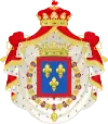 -1823-1848 : coupé de deux : en I, parti de trois : en 1, d'or à quatre pals de gueules, en 2, écartelé en sautoir d'or aux quatre pals de gueules et d'argent à l'aigle de sable, en 3, de gueules à la fasce d'argent et en 4, d'azur semé de fleurs de lys d'or à la bordure componée d'argent et de gueules ; en II, parti d'or à six fleurs de lys d'azur posées 3, 2 et 1 et d'or à six tourteaux mis en orle, cinq de gueules, celui en chef d'azur chargé de trois fleurs de lis d'or ; en III, parti bandé d'or et d'azur de six pièces, à la bordure de gueules et de sable, au lion d'or, armé et lampassé de gueules ; enté en pointe parti d'or, au lion de sable, armé et lampassé de gueules et d'argent à l'aigle éployé de gueules, membré et becqué d'or ; sur-le-tout, écartelé en 1 et 4, de gueules au château d'or ouvert et ajouré d'azur et en 2 et 3 d'argent au lion de gueules armé, lampassé et couronné d'or, enté en pointe du sur-le-tout d'argent à une pomme grenade de gueules, tigée et feuilleté de sinople ; sur-le-tout-du-tout d'azur à trois fleurs de lys d'or à la bordure de gueules. -1848-1870 : d'azur à trois fleurs de lys d'or à la bordure de gueules. |