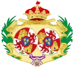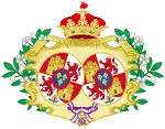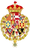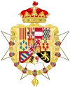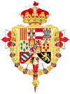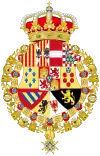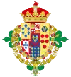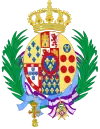 coupé de deux : en I, celui de Bourbon-Sicile (Parti de deux, au I, écartelé : 1 et 4, d'or aux six fleurs de lys d'azur posées 3, 2 et 1 ; 2 et 3, parti de gueules à la fasce d'argent et bandé d'or et d'argent de six pièces à la bordure de gueules ; sur-le-tout d'argent aux cinq écussons disposés en croix d'azur chargés de cinq besans d'argent en sautoir à la bordure de gueules chargée de huit châteaux d'or, donjonnés de trois tours, ouverts et ajourés d'azur ; au II, coupé de 3, au I parti d'écartélé au 1 et 4 de gueules au château d'or, donjonnés de trois tours, ouverts et ajourés d'azur et au 2 et 3 d'argent au lion de pourpre ; et contre-parti d'or aux quatre pals de gueules et écartelé en sautoir d'or aux quatre pals de gueules et d'argent à l'aigle de sable ; enté en pointe d'argent à une pomme grenade de gueules tigée et feuillée de sinople ; au II parti de gueules à la fasce d'argent et d'azur semé de lys d'or à la bordure componée de gueules et d'argent, au III écartélé en 1 taillé d'argent de six pièces à la bordure de gueules et d'or au lion de sable armé et lampassé de gueules au II tranché de sable au lion d'or armé et lampassé de gueules et d'argent à l'aigle de gueules, au 3 semé de lys d'or au lambel de gueules et au 4 d'argent à la croix potencée d'or cantonné de quatre croisettes de même ; au III, d'or à six tourteaux mis en orle, cinq de gueules, celui en chef d'azur chargé de trois fleurs de lis d'or ; sur-le-tout d'azur à trois fleurs de lys d'or posés 2 et 1 à la bordure de gueules ; en II, parti de trois : en 1, d'or à quatre pals de gueules, en 2, écartelé en sautoir d'or aux quatre pals de gueules et d'argent à l'aigle de sable, en 3, de gueules à la fasce d'argent et en 4, d'azur semé de fleurs de lys d'or à la bordure componée d'argent et de gueules ; en II, parti d'or à six fleurs de lys d'azur posées 3, 2 et 1 et d'or à six tourteaux mis en orle, cinq de gueules, celui en chef d'azur chargé de trois fleurs de lis d'or ; en III, parti bandé d'or et d'azur de six pièces, à la bordure de gueules et de sable, au lion d'or, armé et lampassé de gueules ; enté en pointe parti d'or, au lion de sable, armé et lampassé de gueules et d'argent à l'aigle éployé de gueules, membré et becqué d'or ; sur-le-tout, écartelé en 1 et 4, de gueules au château d'or ouvert et ajouré d'azur et en 2 et 3 d'argent au lion de gueules armé, lampassé et couronné d'or, enté en pointe du sur-le-tout d'argent à une pomme grenade de gueules, tigée et feuilleté de sinople ; sur-le-tout-du-tout d'azur à trois fleurs de lys d'or à la bordure de gueules. |
