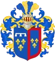 écartelé 1 d'or, parti : en 1, à six tourteaux mis en orle, cinq de gueules, celui en chef d'azur chargé de trois fleurs de lis d'or et en 2 ux six fleurs de lys d'azur posées 3, 2 et 1 ; 2, contre-écartelé en 1 et 4, de gueules au château d'or ouvert et ajouré d'azur et en 2 et 3 d'argent au lion de gueules armé, lampassé et couronné d'or ; 3 à la croix pattée de gueules cantonnée de quatre aigles de sable au vol abaissé et 4, parti de gueules à la fasce d'argent et bandé d'or et du même, à la bande de gueules, chargée de trois alérions d'agent ; sur-le-tout, coupé de argent sur gueules chargé d'un léopard d'or armé de gueules ; sur-le-tout-du-tout d'azur à trois fleurs de lys d'or[37]. |