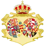 coupé de deux : en I, parti de trois : en 1, d'or à quatre pals de gueules, en 2, écartelé en sautoir d'or aux quatre pals de gueules et d'argent à l'aigle de sable, en 3, de gueules à la fasce d'argent et en 4, d'azur semé de fleurs de lys d'or à la bordure componée d'argent et de gueules ; en II, parti d'or à six fleurs de lys d'azur posées 3, 2 et 1 et d'or à six tourteaux mis en orle, cinq de gueules, celui en chef d'azur chargé de trois fleurs de lis d'or ; en III, parti bandé d'or et d'azur de six pièces, à la bordure de gueules et de sable, au lion d'or, armé et lampassé de gueules ; enté en pointe parti d'or, au lion de sable, armé et lampassé de gueules et d'argent à l'aigle éployé de gueules, membré et becqué d'or ; sur-le-tout, écartelé en 1 et 4, de gueules au château d'or ouvert et ajouré d'azur et en 2 et 3 d'argent au lion de gueules armé, lampassé et couronné d'or, enté en pointe du sur-le-tout d'argent à une pomme grenade de gueules, tigée et feuilleté de sinople ; sur-le-tout-du-tout d'azur à trois fleurs de lys d'or à la bordure de gueules[35], portées ensuite par :