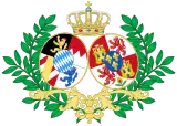 parti en I, écartelé au 1 de sable, au lion d'or, armé et lampassé et couronné de gueules (qui est du comté palatin du Rhin), au 2 Emanché de gueules et d'argent de trois pièces (qui est de Franconie) au 3 bandé d'argent et de gueules au pal d'or brochant sur le tout (qui est de Burgovie), au 4 d'argent au lion d'azur armé lampassé et couronné d'or (qui est de Veldenz) et sur le tout fuselé en bande d'azur et d'argent (qui est de Bavière) ; en II écartelé en 1 et 4, de gueules au château d'or ouvert et ajouré d'azur et en 2 et 3 d'argent au lion de gueules armé, lampassé et couronné d'or, enté en pointe du sur-le-tout d'argent à une pomme grenade de gueules, tigée et feuilleté de sinople sur-le-tout d'azur à trois fleurs de lys d'or à la bordure de gueules, après 1883, d'azur à trois fleurs de lys d'or[Information douteuse]. |