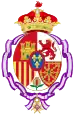 coupé de deux : en I, parti de trois : en 1, d'or à quatre pals de gueules, en 2, écartelé en sautoir d'or aux quatre pals de gueules et d'argent à l'aigle de sable, en 3, de gueules à la fasce d'argent et en 4, d'azur semé de fleurs de lys d'or à la bordure componée d'argent et de gueules ; en II, parti d'or à six fleurs de lys d'azur posées 3, 2 et 1 et d'or à six tourteaux mis en orle, cinq de gueules, celui en chef d'azur chargé de trois fleurs de lis d'or ; en III, parti bandé d'or et d'azur de six pièces, à la bordure de gueules et de sable, au lion d'or, armé et lampassé de gueules ; enté en pointe parti d'or, au lion de sable, armé et lampassé de gueules et d'argent à l'aigle éployé de gueules, membré et becqué d'or ; sur-le-tout, écartelé en 1 et 4, de gueules au château d'or ouvert et ajouré d'azur et en 2 et 3 d'argent au lion de gueules armé, lampassé et couronné d'or, enté en pointe du sur-le-tout d'argent à une pomme grenade de gueules, tigée et feuilleté de sinople ; sur-le-tout-du-tout d'azur à trois fleurs de lys d'or[Information douteuse]. avant 1941 : coupé de deux : en I, parti de trois : en 1, écartelé en sautoir d'or aux quatre pals de gueules et d'argent à l'aigle de sable, en 2, d'argent à croix de Jérusalem, d'or, en 3, de gueules à la fasce d'argent et en 4, d'azur semé de fleurs de lys d'or à la bordure componée d'argent et de gueules ; en II, parti d'or à six fleurs de lys d'azur posées 3, 2 et 1 (ou 1,2,2,1) et d'or à six tourteaux mis en orle, cinq de gueules, celui en chef d'azur chargé de trois fleurs de lis d'or ; en III, parti bandé d'or et d'azur de six pièces, à la bordure de gueules et de sable, au lion d'or, armé et lampassé de gueules ; enté en pointe parti d'or, au lion de sable, armé et lampassé de gueules et d'argent à l'aigle éployé de gueules, membré et becqué d'or ; sur-le-tout, écartelé au 1 de gueules au château d'or couvert et ajouré d'azur, au 2 d'argent au lion de pourpre armé, lampassé et couronné d'or, au 3 d'or aux quatre pals de gueules, au 4 de gueules aux chaînes d'or posées en orle, en croix et en sautoir, chargées en cœur d'une émeraude au naturel, accompagné en pointe d'argent à une pomme grenade de gueules tigé et feuillé de sinople et sur le tout d'azur aux trois fleurs de lys d'or à la bordure de gueule[41]. -1941 - 1977 Prétendant au trône d’Espagne. |