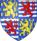 D'azur semé de fleurs de lys d'or, à la bordure componée de gueules et d'argent[12]. Écartelé des précédentes et de Bourgogne[12].
