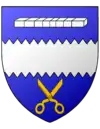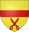 D'azur, à la paire de ciseaux à tondre d'argent garnis de gueules, accostés de deux broches doubles d'argent, garnies et chardonnées d'or, le manche de chacune garni de gueules; le tout posé en pal et chaque broche surmontée d'une étoile d'or |