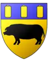 d'or, au porc passant de sable, et au chef d'azur chargé de trois cervelas d'or |