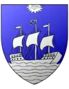 D'azur, au navire d'argent posé sur une onde alaisée de même, le grand mât orné de la bannière de France, frangée d'or, surmonté d'une grappe de raisin de même, tigée et feuillée aussi d'or ; le tout cotoyé de six navires d'argent, posés en pal, trois de chaque côté |