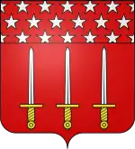 De sinople, à une épée haute d'or ; au chef des ducs de l'Empire brochant.[2],[5],[6],[7],[8] |