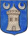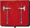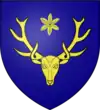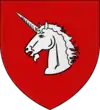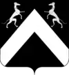 D'argent au lion de sable, la queue fourchée passée en sautoir, chargé d'une étoile d'or sur l'épaule. |