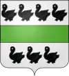 D'argent à la fasce de sinople, accompagnée de sept merlettes de sable, quatre & trois. |