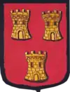 De gueules au lion d'or, surmonté de trois tours d'argent. |