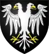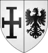 Parti d’argent, à la croix potencée de sable ; et d’argent, à l’aigle éployée de sable |