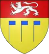 D'or à trois bannières rangées d'azur, au chef de gueules chargé d'un lion passant d'argent.[23]