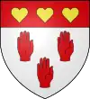 D'argent, à trois mains droites levées et appaumées de gueules, posées 2 et 1 ; au chef de gueules, chargé de trois cœurs d'or en fasce.[13] |
