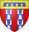 De gueules au lion d'argent, à la bande d'azur brochant sur le tout ; au chef de gueules soutenu d'azur, et chargé de trois coquilles d'argent.[29]
