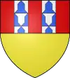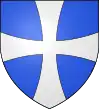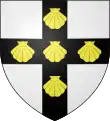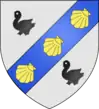 D'argent à une barre (alias bande) d'azur chargée de trois coquilles d'or, accompagnée de deux merlettes de sable, l'une en chef, l'autre en pointe.[26] Alias au croissant d'azur sur le 2e quartier.[24] |