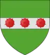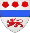 D'argent à la fasce d'azur, accompagnée en chef de trois roses de gueules [rangées en fasce] et en pointe d'un lion léopardé du même.[22] |