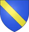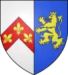 D'azur, à trois fleurs de lys d'or, 2 et 1, à la cotice de gueules brochant sur le tout.[37]
