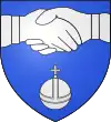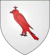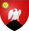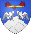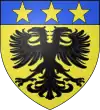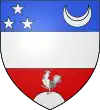 Coupé d'azur et de gueules, à la fasce d'argent accompagnée en pointe d'un coq d'argent chantant sur un mont de même ; au franc-canton de trois étoiles 1 et 2, accosté à senestre d'un croissant, le tout d'argent.[1] Alias de gueules à la bande d'argent accompagnée d'un coq sur un roc de même, au chef cousu d'azur chargé de trois étoiles surmontées d'un croissant. |