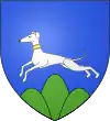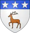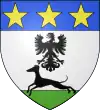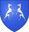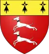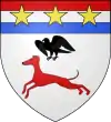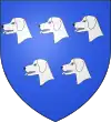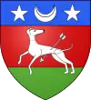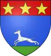 D'azur, au limier d'argent passant sur une terrasse de sinople ; au chef cousu de gueules chargé de trois étoiles d'or.[1] |