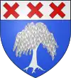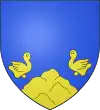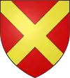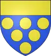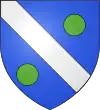 D'azur, au sautoir d'or, accompagné de trois besants du même, un en chef, deux en flancs, et en pointe une rivière ondée d'argent.[1] |