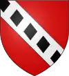 De gueules, à la bande d'argent chargée de trois losanges [et deux demi-losanges] de sable.[1] |