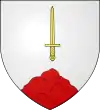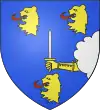 D'azur, au dextrochère d'or sortant d'une nuée d'argent mouvante de la pointe du flanc senestre, tenant une épée d'argent la garde et la poignée d'or ; accompagnée de trois têtes de lions arrachées d'or, lampassées de gueules, posées deux en chef et une en pointe.[1] Alias posées une en chef et deux en pointe. |