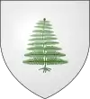Parti : au 1, palé d'or et d'azur, à six pièces ; au 2, d'or au pin de sinople, au chef de gueules chargé de trois étoiles d'or.[1] |