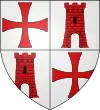 écartelé, au 1 et 4 d'argent à la croix pattée de gueules et au 2 et 3 d'argent à la tour de gueules crénelée de trois pièces ouverte d'argent et ajourée et maçonnée de sable[6].