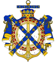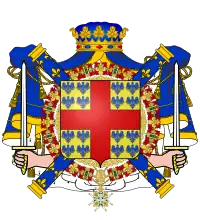 Ecartelé : aux I et IV, de gueules semés de trèfles d'or, à deux bars adossés de même (Clermont-en-Beauvaisis) ; aux II et III, bandé d'or et de gueules ; au franc-quartier d'or chargé d'une croix de gueules cantonnée de seize alérions d'azur, le franc-quartier lui-même cantonné d'un franc-quartier d'argent à une molette de sable.[14] | |