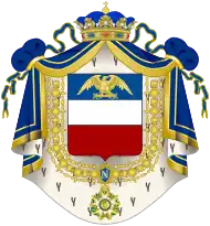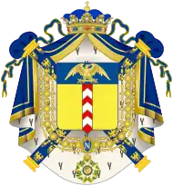 Ecartelé : I et IV, de gueules, au lion d'or couronné du même, tenant dans sa patte dextre un faisceau de sept flèches d'argent, pointées et empennées d'or, et dans sa patte sénestre, une épée d'argent, garnie d'or (Provinces-Unies) ; II et III, d'azur, à l'aigle d'or, la tête contournée, au vol abaissé, empiétant un foudre du même (de Napoléon).[3] |
