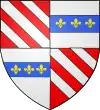 Coupé et parti en 3, au premier fascé de gueules et d'argent, au second d'azur semé de lys d'or et au lambel de gueules, au troisième d'argent à la croix potencée d'or, cantonnée de quatre croisettes du même, au quatrième d'or aux quatre pals de gueules au cinquième parti d'azur semé de lys d'or et à la bourdure de gueules, au sixième d'azur au lion contourné d'or, armé, lampassé et couronné de gueules, au septième d'or au lion de sable armé et lampassé de gueules, au huitième d'azur semé de croisettes d'or et aux deux bar d'or. Sur le tout d'or à la bande de gueules chargé de trois alérions d'argent le tout brisé d'un lambel d'azur[21]. |