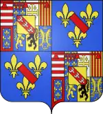 Coupé et parti en 3, au premier fascé de gueules et d'argent, au deuxième d'azur semé de lys d'or et au lambel de gueules, au troisième d'argent à la croix potencée d'or, cantonnée de quatre croisettes du même, au quatrième d'or aux quatre pals de gueules au cinquième parti d'azur semé de lys d'or et à la bordure de gueules, au sixième d'azur à un lion contourné d'or, armé, lampassé et couronné de gueules, au septième d'or à un lion de sable armé et lampassé de gueules, au huitième d'azur semé de croisettes recroisetée au pied fiché d'or, à deux bar adossés du même. Sur le tout d'or à la bande de gueules chargé de trois alérions d'argent le tout brisé d'un lambel et d'une bordure de gueules[14]. |